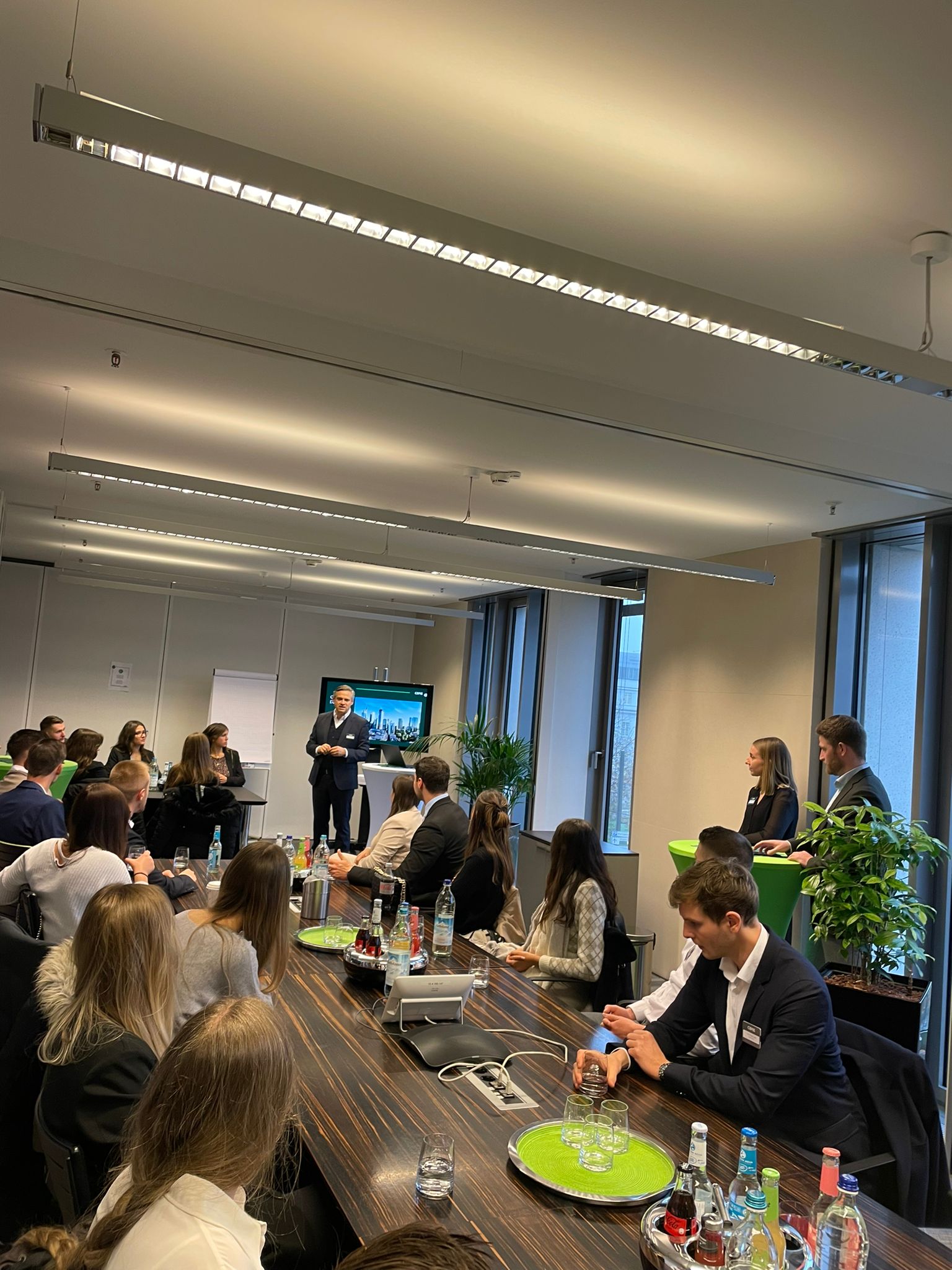 Am Mittag ging es gemeinsam zu einer Unternehmensvorstellung mit anschließender Case Study ins Büro von CBRE. Dort wurden die Teilnehmenden von Oliver Küppers begrüßt und bekamen einen kleinen Einblick in das Unternehmen. Im Anschluss bekamen wir von Mara Schramm und Benjamin Breier einen Überblick über Ihr Berufsfeld – Capital Markets. Der Vortrag war sehr offen gestaltet und es war viel Platz für Fragen. Zum Ende gab es Zeit zum Networken und einige bereitgestellte Snacks.